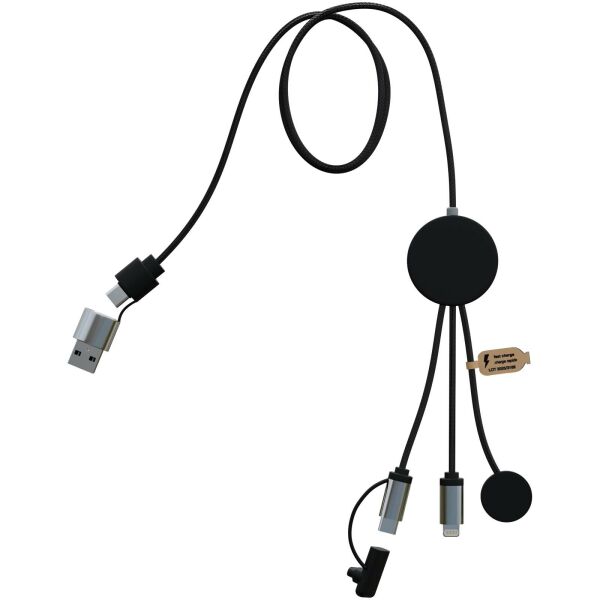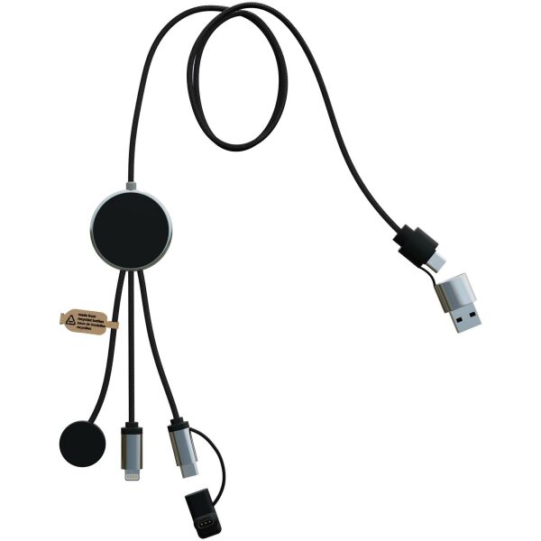 Deze 7-in-1 oplaadkabel is speciaal ontworpen voor smartwatches en beschikt over vijf uitgangsconnectoren: Lightning, Type-C, Apple Watch, Samsung Watch en een Garmin-connector. Hij bevat dubbele ingangen (USB-A en USB-C) voor volledige compatibiliteit met de nieuwste USB-C-apparaten en computers. De snoeren zijn gemaakt van gerecyclede plastic flessen, en de kabel kan twee of drie apparaten tegelijk opladen. Wordt geleverd met frontpersonalisatie en verpakt in een recyclebare TPU-sleeve met gerecycled papier.